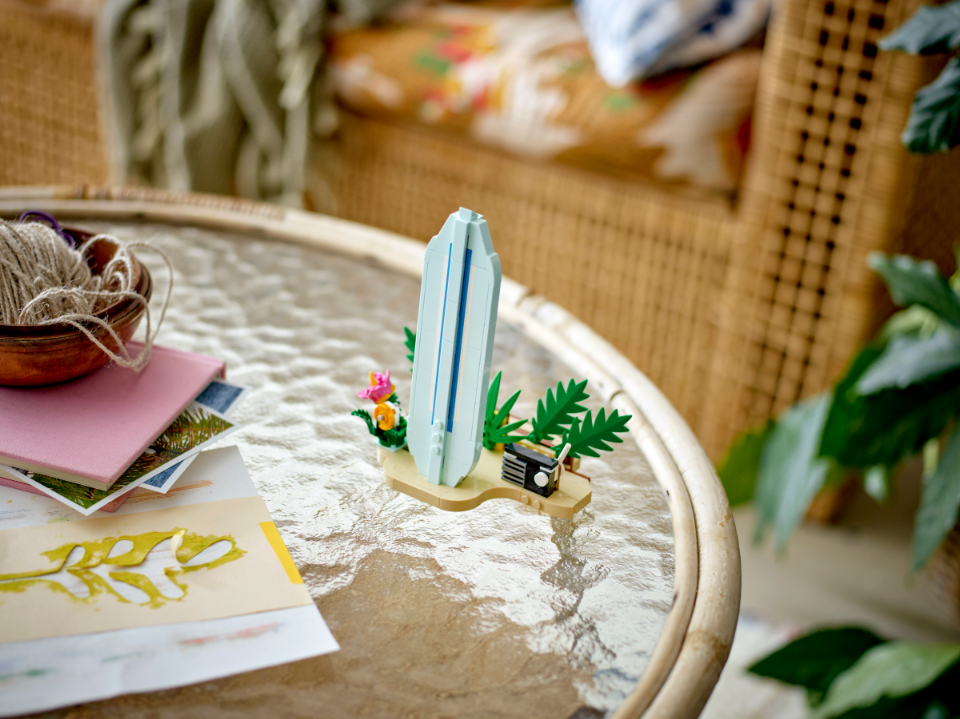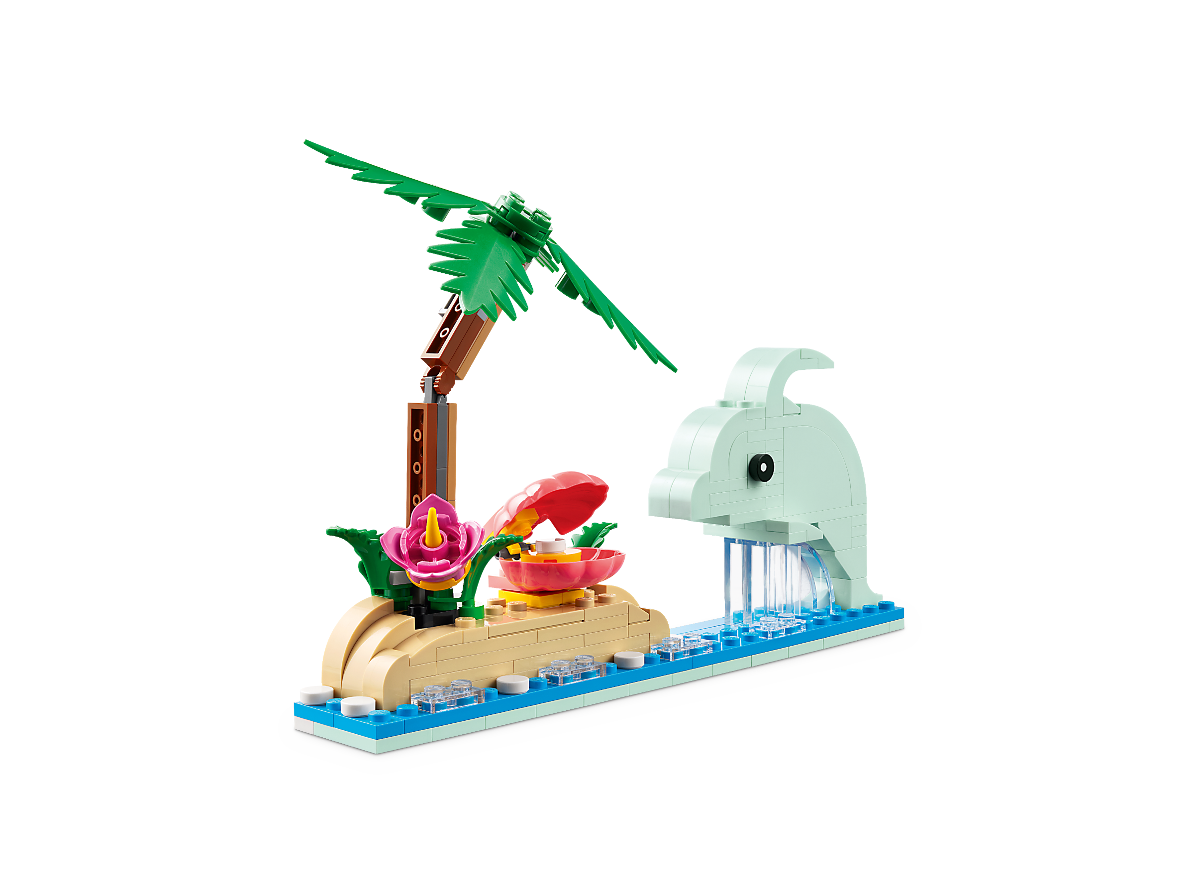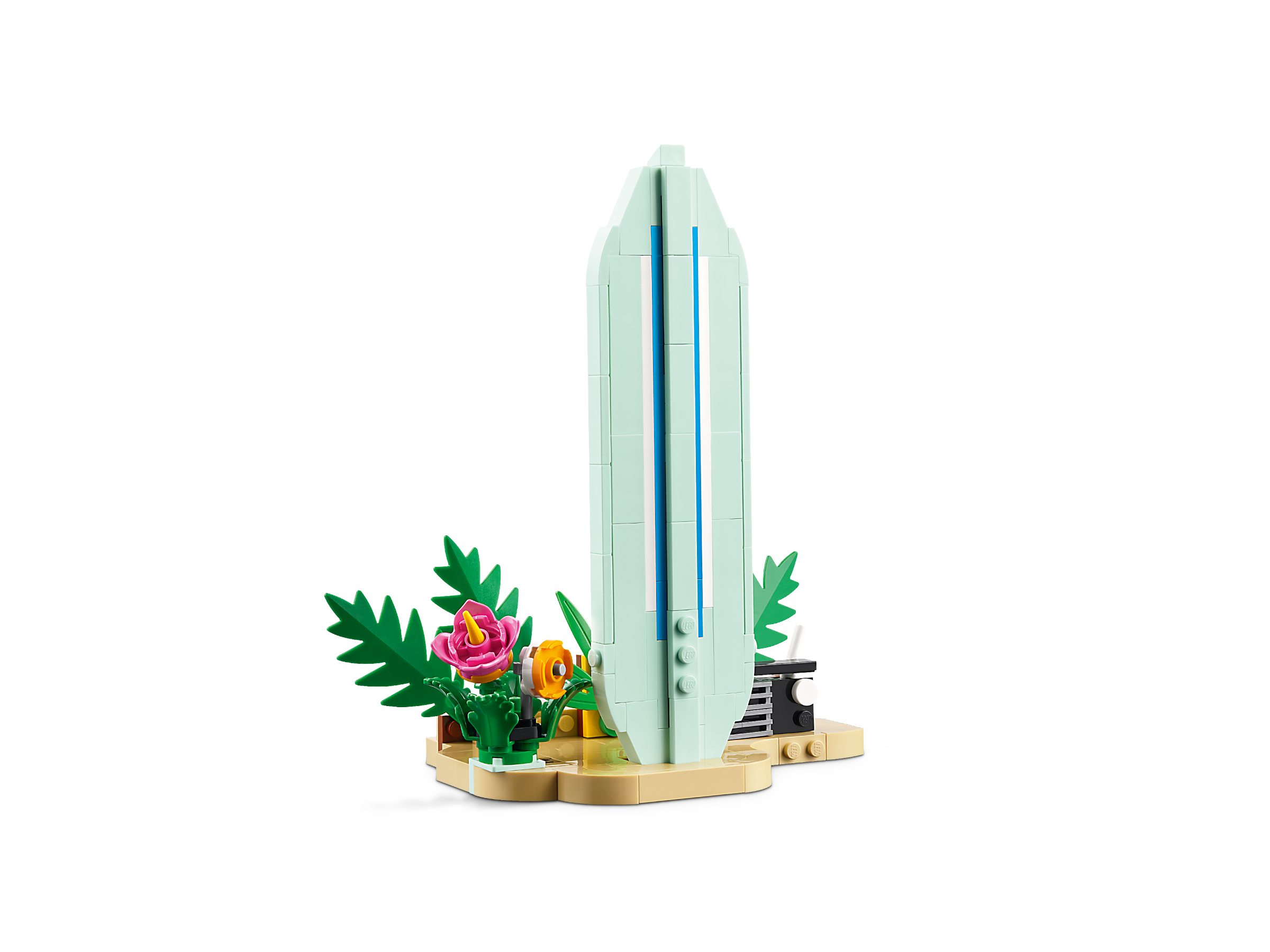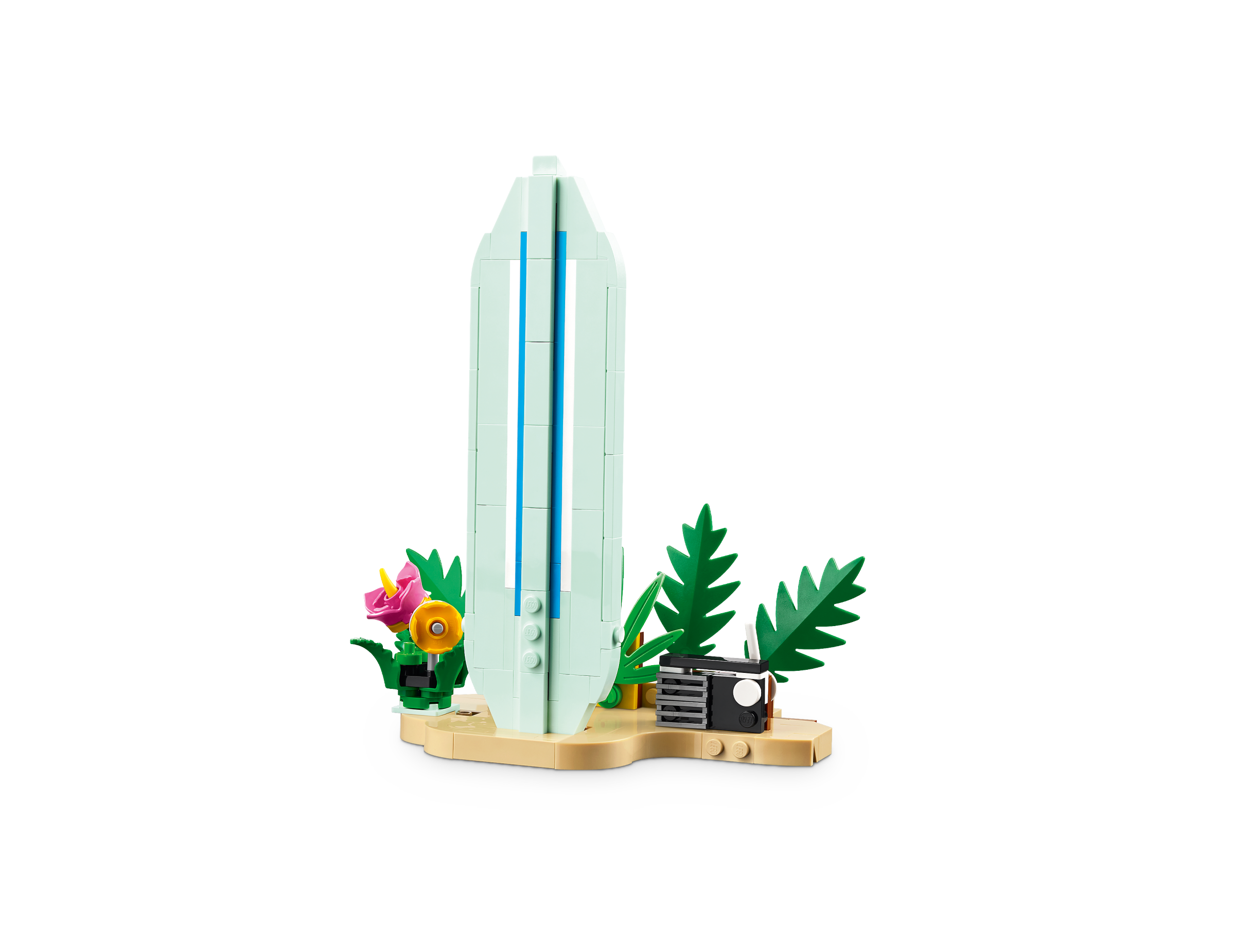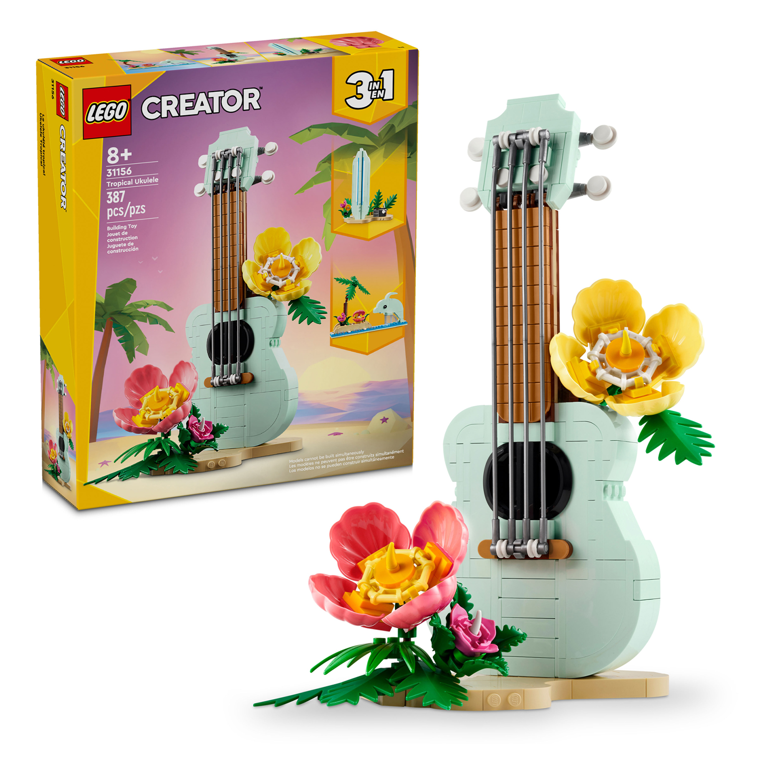 Ten zestaw 3 w 1 LEGO Creator umożliwia zbudowanie trzech różnych modeli z tego samego kompletu klocków. Dzieci mogą stworzyć ukulele i przebudować instrument na małego skaczącego delfina na podstawce przedstawiającej ocean i plażę z palmą, kwiatami i muszlą albo na odczepianą deskę surfingową na plażowej podstawce z kwiatami i radiem.