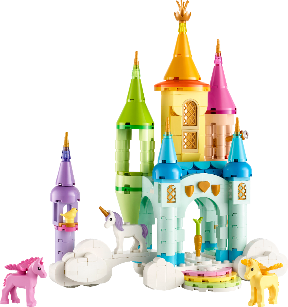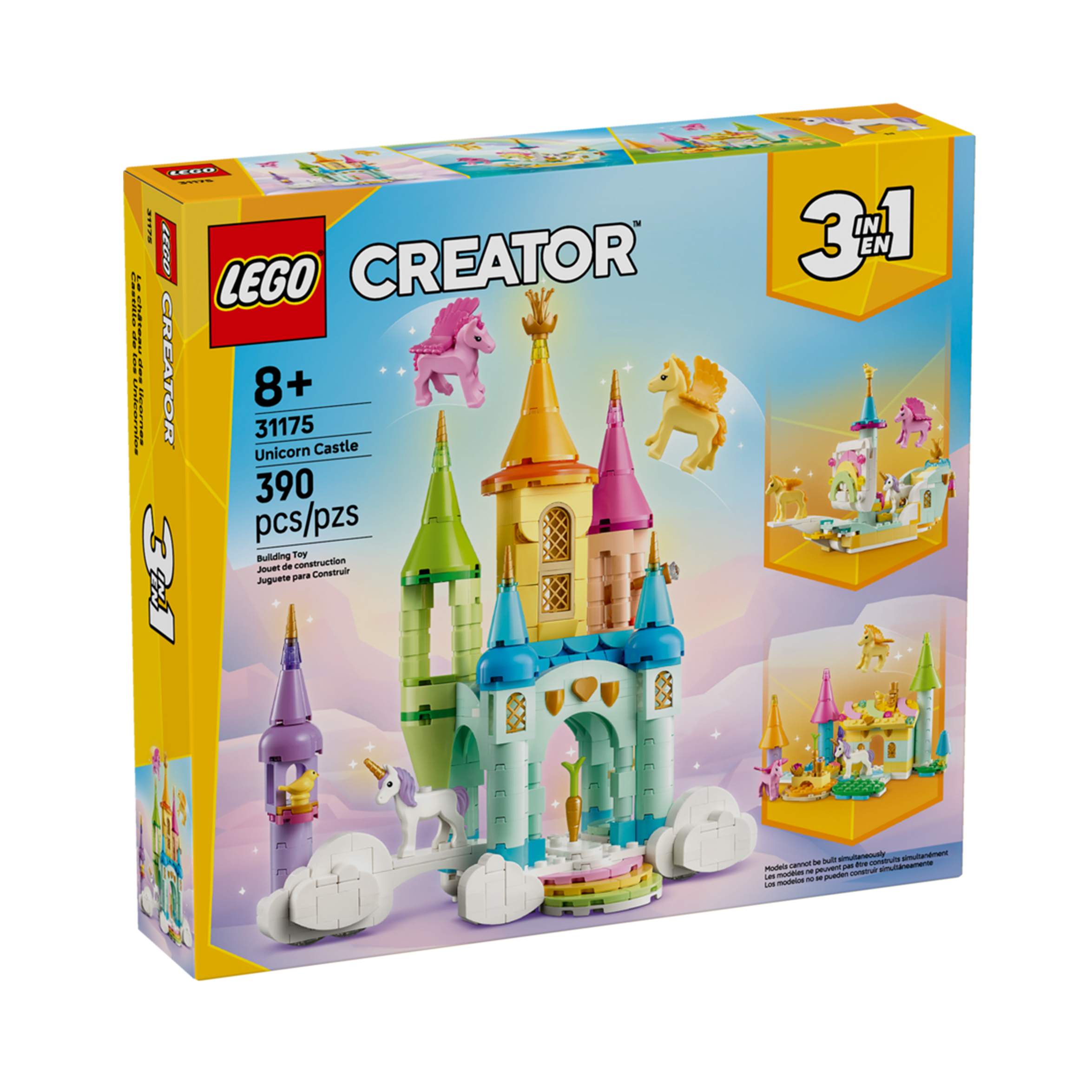 - Trzy zabawki dla dzieci w jednym pudełku — zestaw LEGO® Creator 3 w 1 Zamek jednorożców umożliwia ośmiolatkom i starszym dzieciom zbudowanie i przebudowywanie trzech różnych zabawek z tych samych klocków