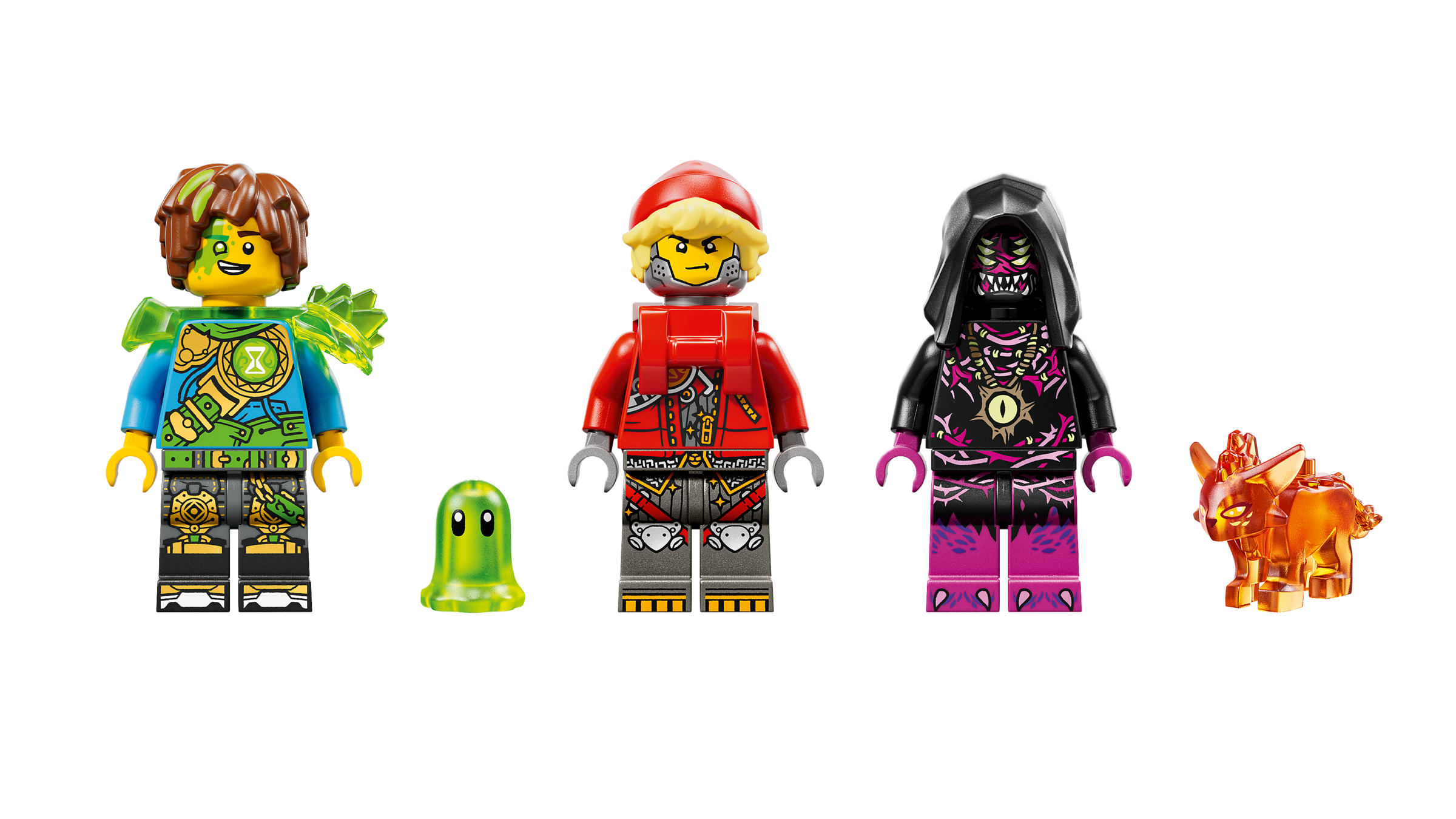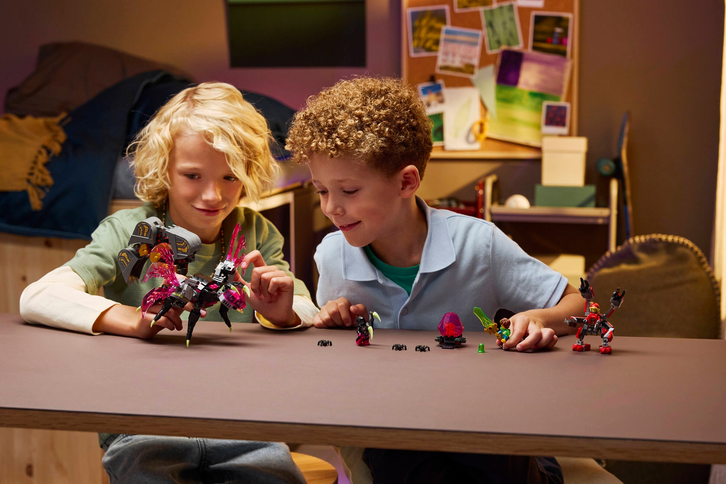 Do zestawu dołączono znane postacie. Są minifigurki Mateo, Cooper i Ariki. Mateo trzyma kolekcjonerski zielony miecz, który doda odwagi w każdym starciu. W pudełku jest też uroczy Z-Blob oraz trzy pająki, idealne do pułapek i zasadzek. Znajdziesz różowe diamentowe jajo skażone przez Koszmarnego Imperatora. Z jaja wykluwa się kolekcjonerski Pomarańczowy Skarbeniek. To świetna baza do tworzenia historii. Dzieci mogą prowadzić pościgi, ratować sojuszników i budować własne misje w świecie snów.