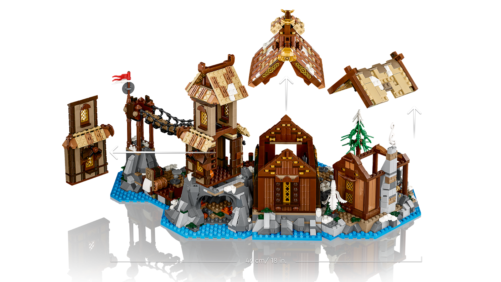 LEGO Ideas Wioska Wikingów obejmuje trzy fascynujące budowle. Zobacz, jak realistycznie została oddana kuźnia z funkcją płomieni. Przekonaj się, jak pięknie zdobią dom jarla detale, takie jak wspaniale wyrzeźbione tarcze z symbolami kruków i wilków Odyna. Wieża strażnicza zachwyca kunsztownymi detalami i pozwala snuć historie o bohaterskich obrońcach wioski.