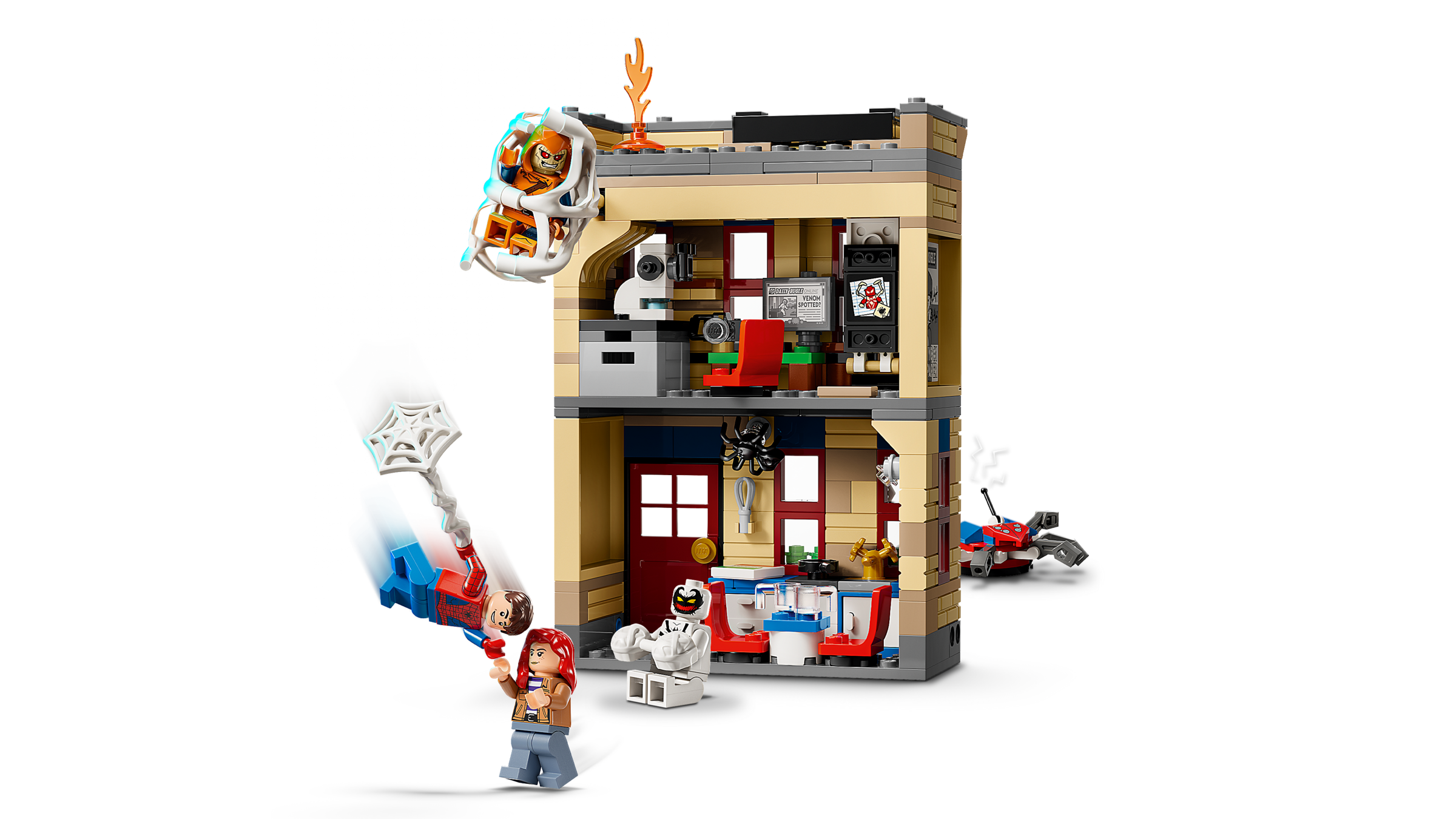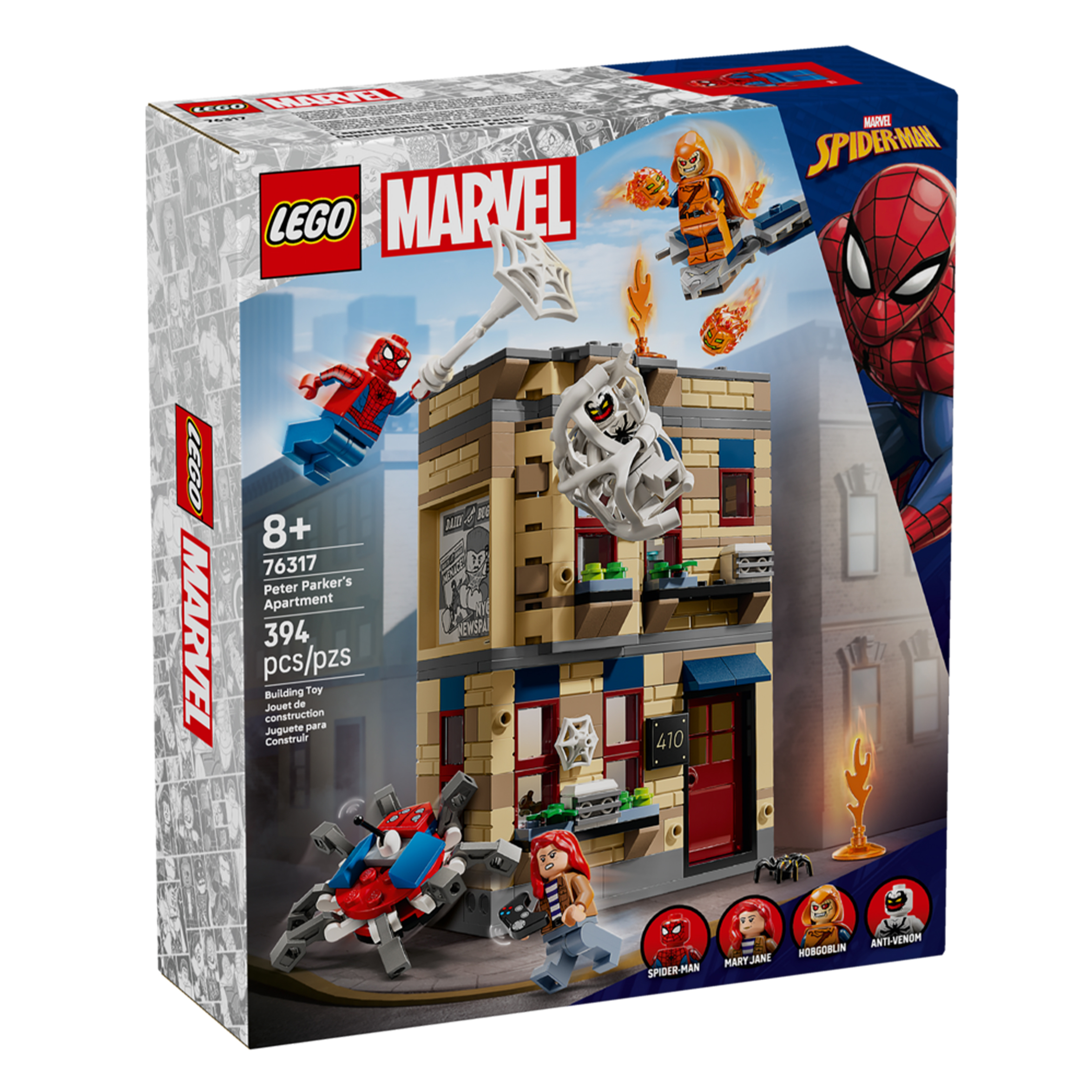 Zestaw do zbudowania zawiera cztery minifigurki: Hobgoblina na szybowcu z bombami dyniowymi; Spider-Mana i Anti-Venoma, strzelających pajęczynami oraz Mary Jane z robopająkiem. Gigantyczna, elastyczna pajęczyna przymocowana do budynku pozwala na uwięzienie minifigurki. Na pierwszym piętrze mieszkania znajduje się kuchnia. Na górnym poziomie znajduje się gabinet i sypialnia z rozkładanym łóżkiem, biurkiem, komputerem, aparatem i mikroskopem. Funkcja przycisku sprawia, że część budynku się zawala. Dzieci mogą połączyć ten zestaw z zestawami Spider-Man i Oscorp (76324) oraz Multiwersum: Miles Morales kontra Spot (76311), by poszerzyć możliwości zabawy. Zestaw zawiera 394 elementy.