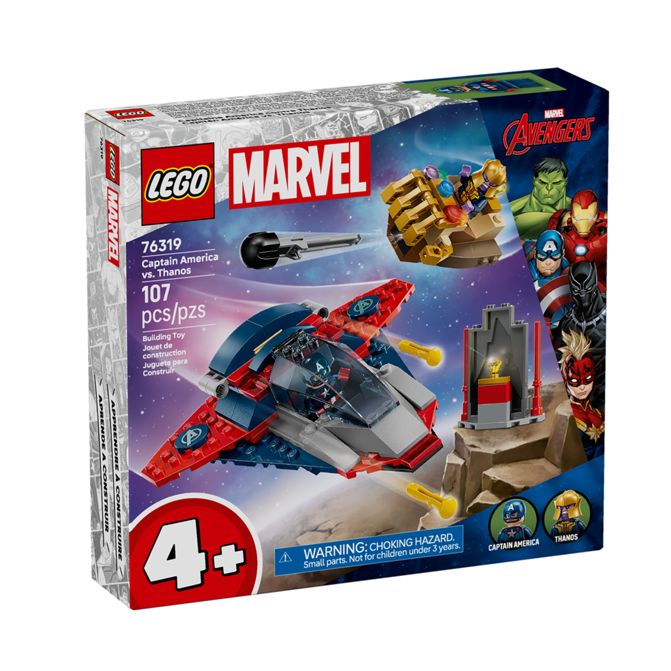 Zestaw LEGO Marvel 76319 składa się ze 107 elementów i oferuje różnorodne możliwości zabawy. Thanos to potężny przeciwnik, którego statek kosmiczny inspirowany jest Rękawicą Nieskończoności z ruchomymi „palcami” i wyrzutnią rakiet. Do akcji wkracza Quinjet, którym Kapitan Ameryka chroni kosmiczny kamień przed złodziejskim Thanosem. Zestaw zawiera intuicyjne instrukcje, co pozwala dzieciom szybko złożyć modele i oddać się zabawie.