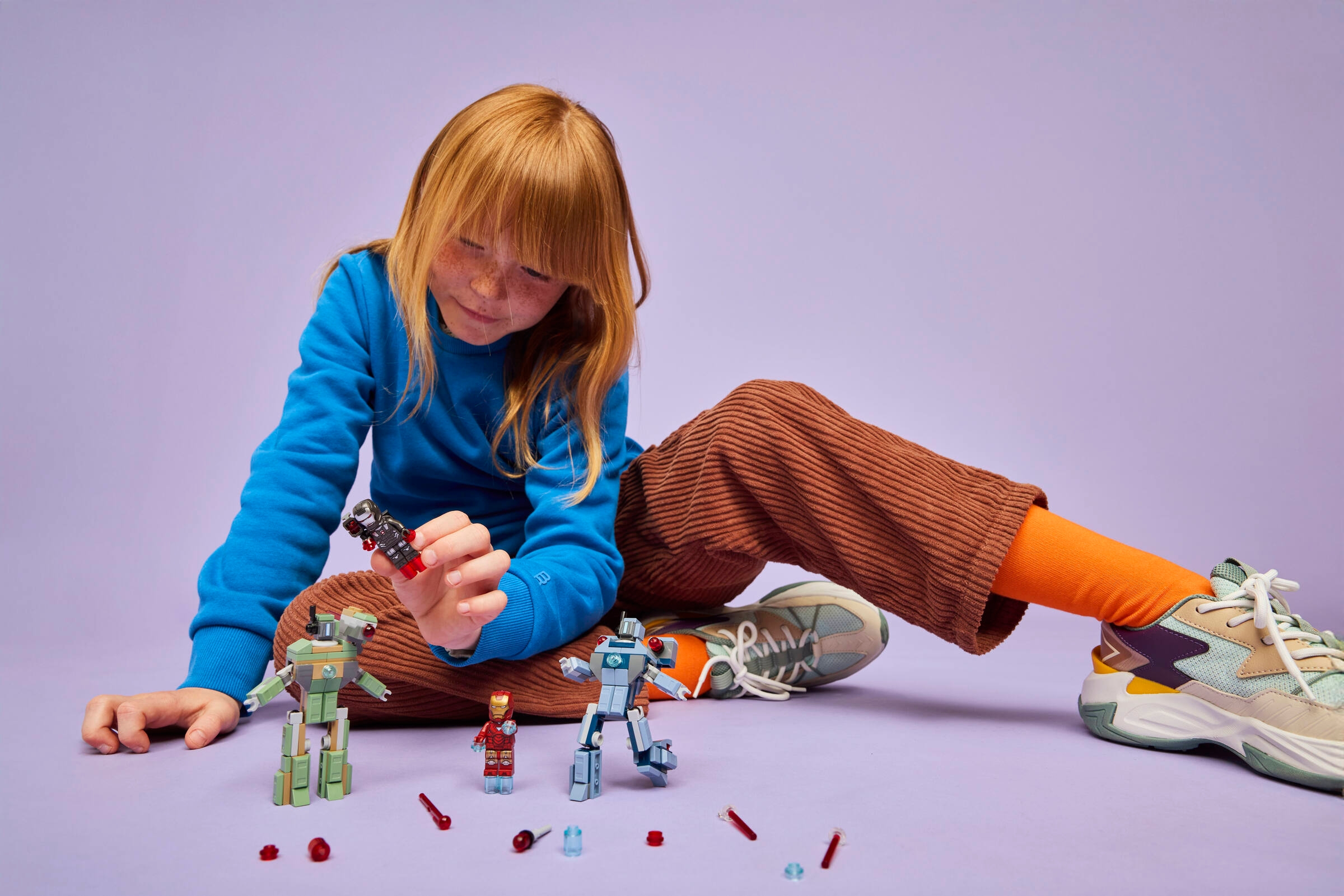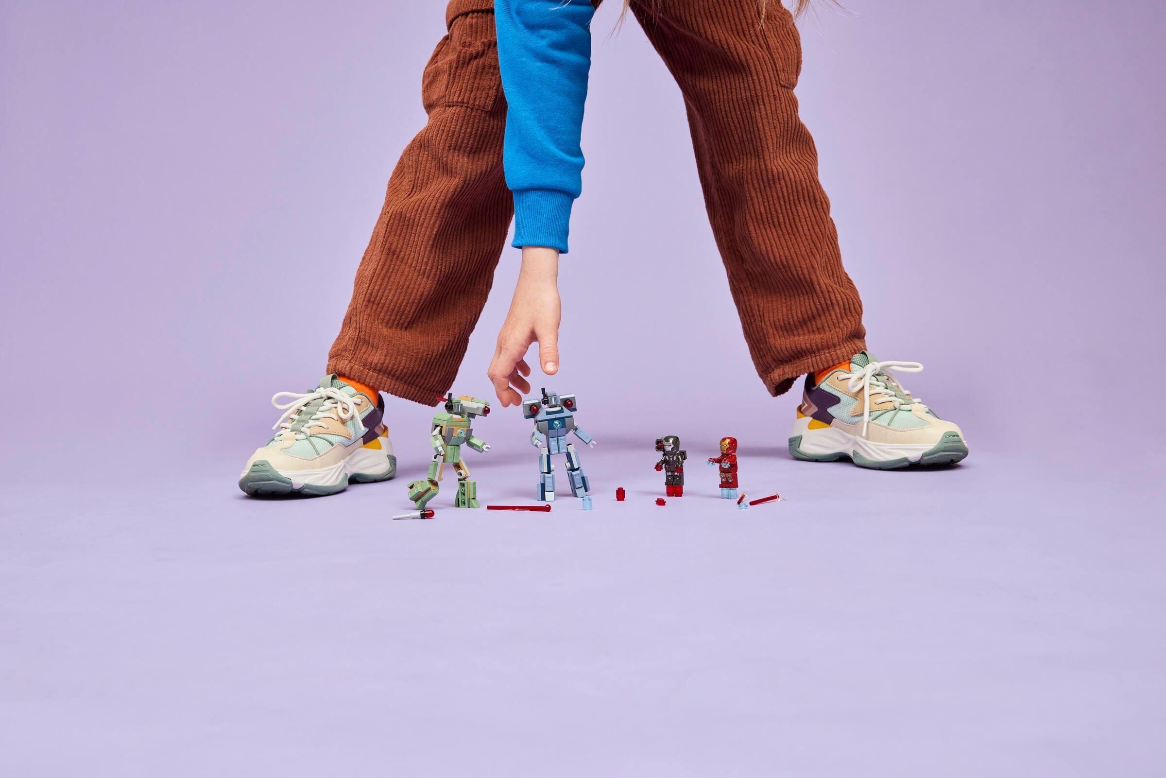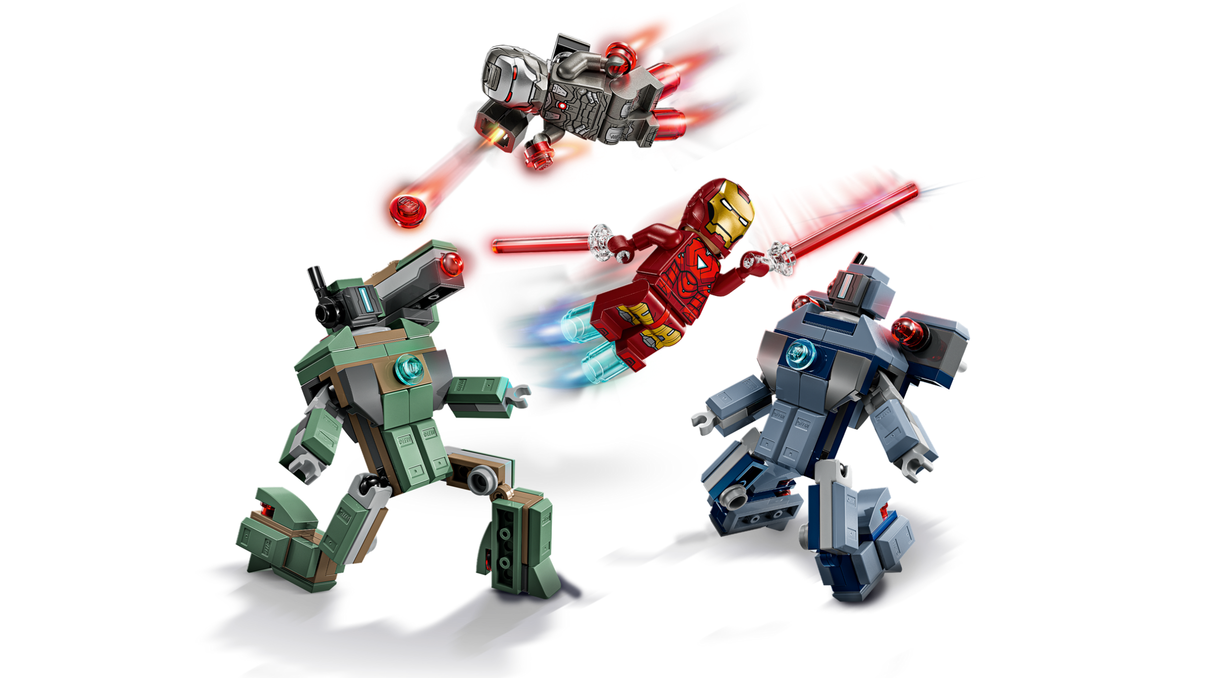 Iron Man z niebieskimi blasterami w rękach i stopach oraz War Machine wyposażony w czerwone blastery wraz z miotaczem klocków to pewność, że żadna bitwa z dronami nie będzie łatwa. Każdy z bohaterów ma swoje unikalne uzbrojenie, które pozwala na różnorodne scenariusze walki.
