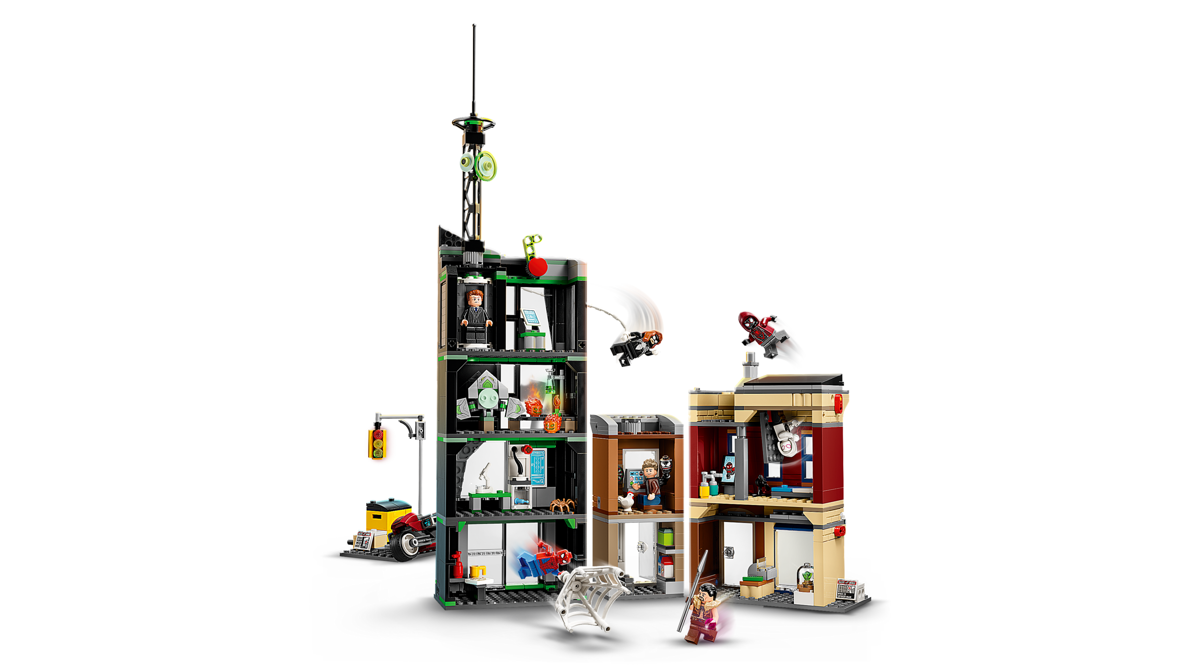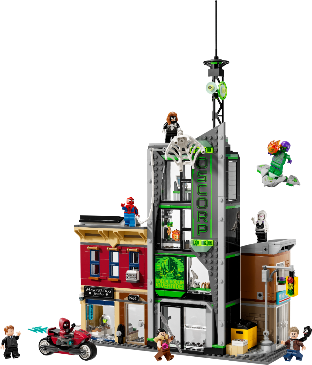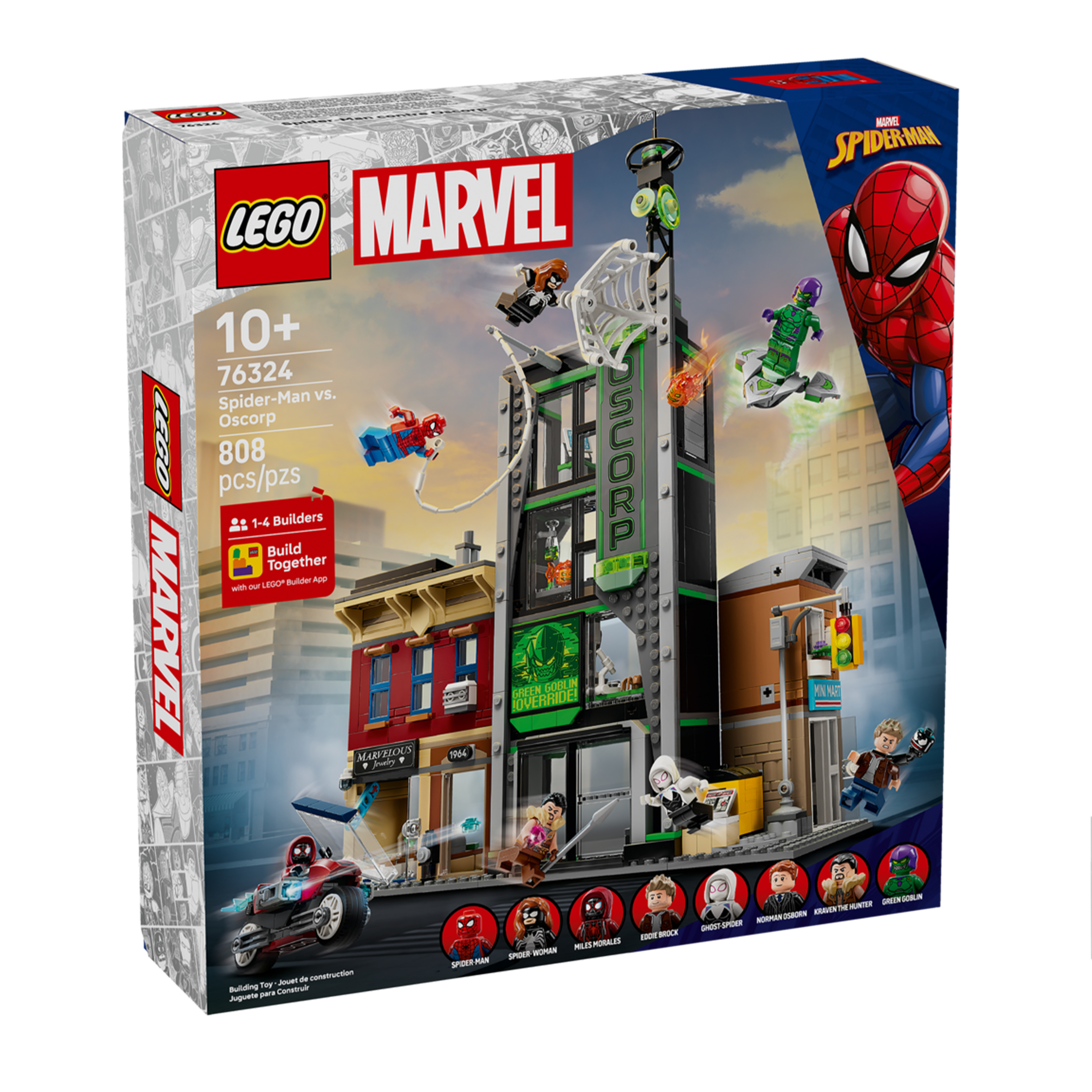 Zestaw LEGO ǀ Marvel Spider-Man i Oscorp zawiera aż osiem minifigurek inspirowanych filmami Marvela. W skład ekipy superbohaterów wchodzą: Spider-Man, Spider-Woman, Miles Morales na motocyklu oraz Ghost-Spider. Nie zabrakło także złoczyńców takich jak Eddie Brock, Norman Osborn, Kraven the Hunter i Zielony Goblin. Każda z postaci posiada unikalne akcesoria, które wzbogacają zabawę. Szybowiec Zielonego Goblina, broń i dodatkowe przedmioty kryją się w każdym zakątku tego kreatywnego zestawu.
