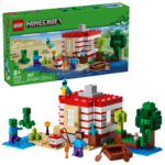 LEGO® Minecraft® 21275 to więcej niż tylko budynek. W zestawie znajdują się minifigurki popularnych postaci z gry – Steve’a, Creepera™ i zombie, które ożywią każdą przygodę. Dodatkowo, liczne akcesoria, takie jak łódź, wędka, ryba, papuga oraz bujna roślinność, urozmaicają zabawę i dodają realizmu każdej historii zbudowanej przez małego gracza. To prawdziwy raj dla fanów Minecrafta, gdzie każda przygoda jest możliwa.