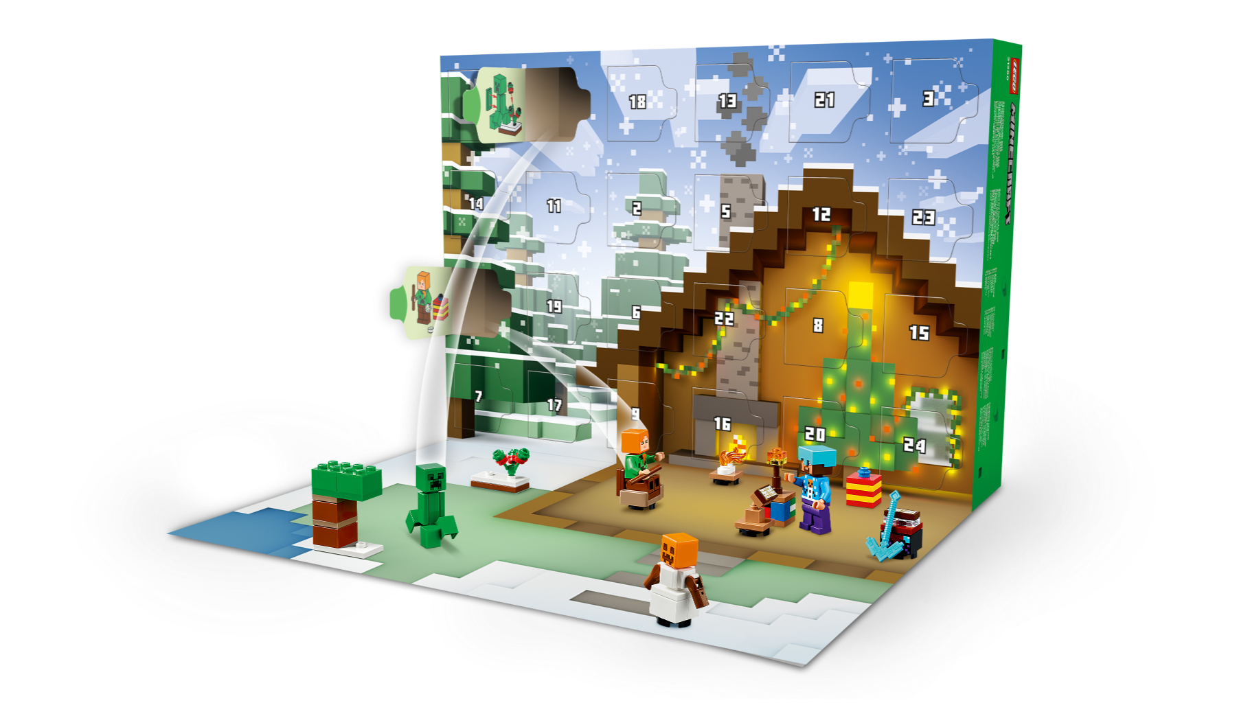 W każdym z 24 okienek kryje się prezent, który dzieci odkrywają przed gwiazdką. Minifigurki obejmują Alex w swetrze z Creeperem™, Steve’a w swetrze z bałwankiem, diamentowym hełmie i z kilofem, Creepera przy krzaku słodkich jagód; utopca z trójzębem; tułacza w diamentowej zbroi; śnieżnego golema; zombie z zaklętym toporem i osadnika w stroju Świętego Mikołaja z piecem. Jest też mnóstwo małych modeli i fajnych akcesoriów, które dzieci rozpoznają z popularnej gry. W miarę zbliżania się wielkiego dnia, dzieci mogą łączyć prezenty, abystworzyć małą zimową wioskę w stylu Minecrafta i odgrywać niekończące się przygody. W zestawie jest nawet rozkładana mata do zabawy, która zapewni idealne tło.