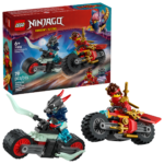 Przygotuj się na pełną adrenaliny przygodę z LEGO NINJAGO 71838 – Wyścig Motocyklowy Kaia. Dzieci od 6 lat mogą teraz odtworzyć zapierające dech w piersiach sceny z trzeciego sezonu „NINJAGO Powstanie Smoków”. Zestaw zawiera dwa wystrzałowe motocykle ninja, które wzbogacą zabawę w pościgi. Motocykl Kaia wyróżnia się dwoma sztyletami, a demoniczny pojazd złego zwiadowcy Spektralnych Dragonów zapewnia niepowtarzalny dreszczyk emocji.