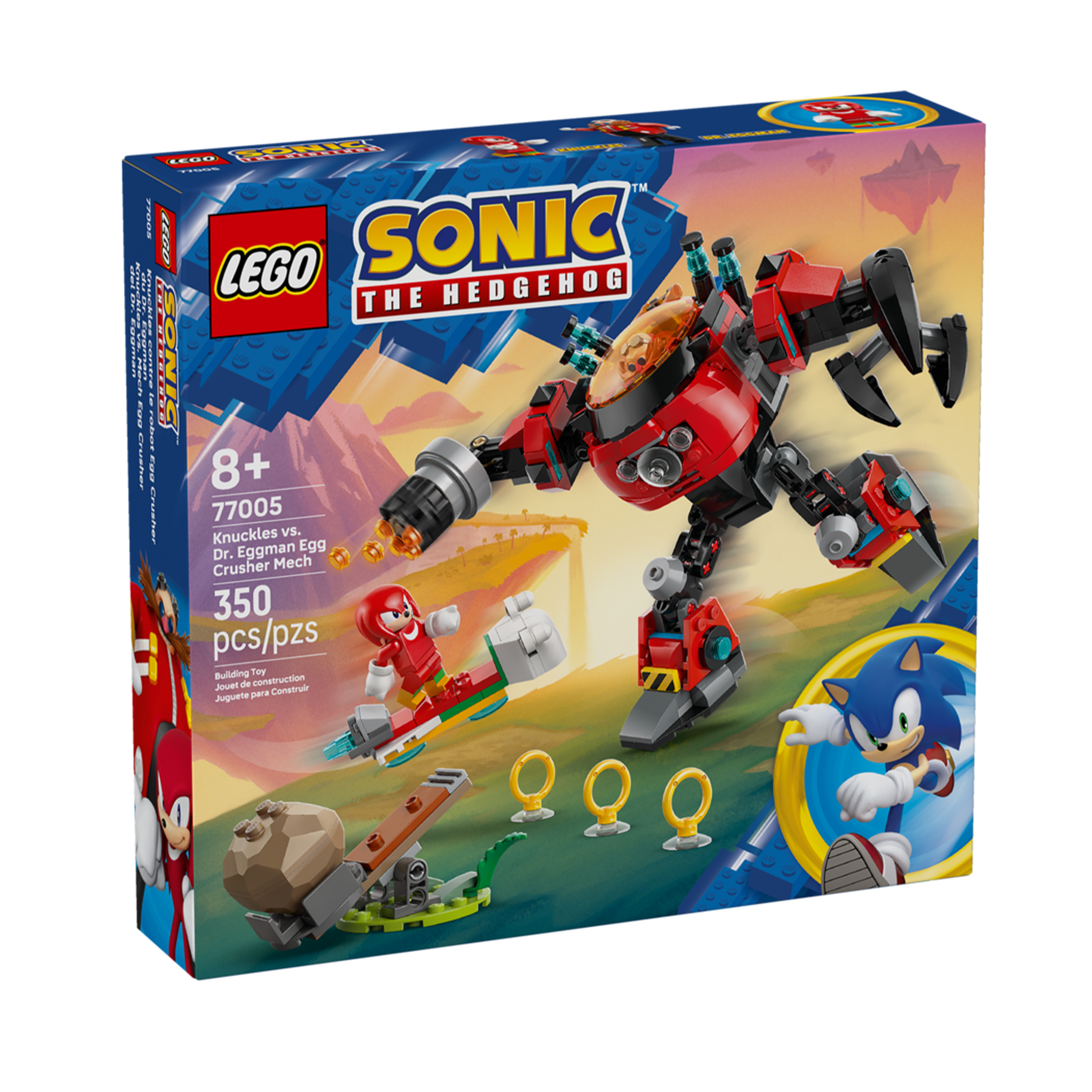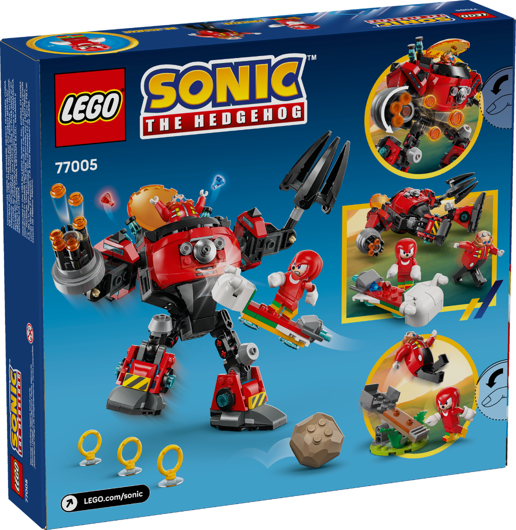 Zaskocz chłopców, dziewczynki i fanów Sonica w wieku od ośmiu lat zestawem Knuckles kontra Dr. Eggman w mechu Egg Crusher (77005). Ten prezent dla graczy obejmuje wielofunkcyjnego, ruchomego mecha z otwieranym kokpitem, obrotową wyrzutnią na sześćklocków, wielkim obrotowym pazurem i ruchomymi kończynami do interaktywnej zabawy. Dwie postacie, Knuckles i Dr. Eggman, są gotowe na zabawę w odgrywanie ról. Całość uzupełnia deskolotka, katapulta z dwoma głazami, trzy złote pierścienie i dwa Szmaragdy Chaosu.