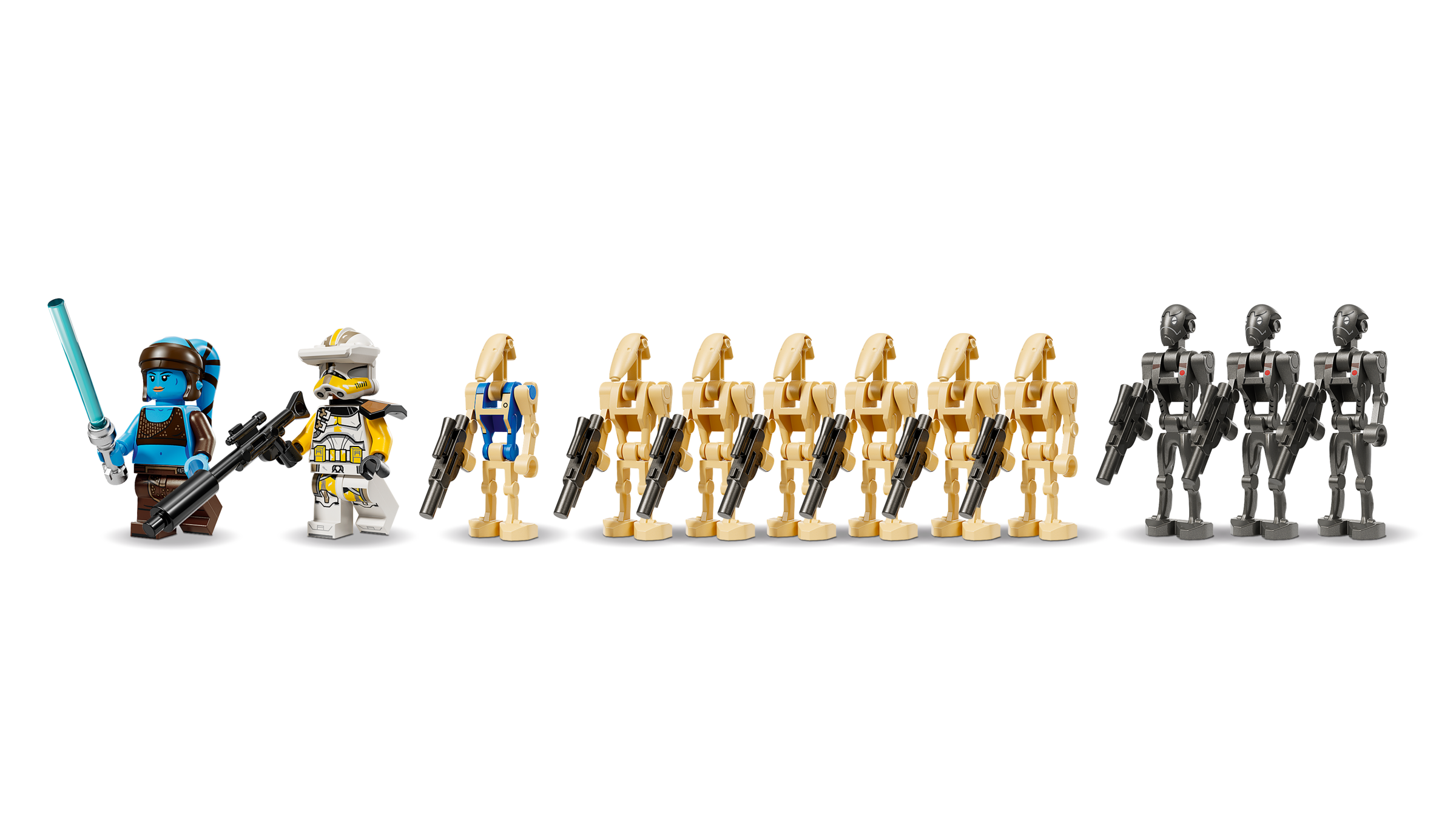 • Postacie LEGO® Star Wars™ — minifigurki LEGO komandora Bly i Aayli Secury, trzy figurki LEGO droidów komandosów, droid bojowy pilot i sześć figurek LEGO droidów bojowych z akcesoriami