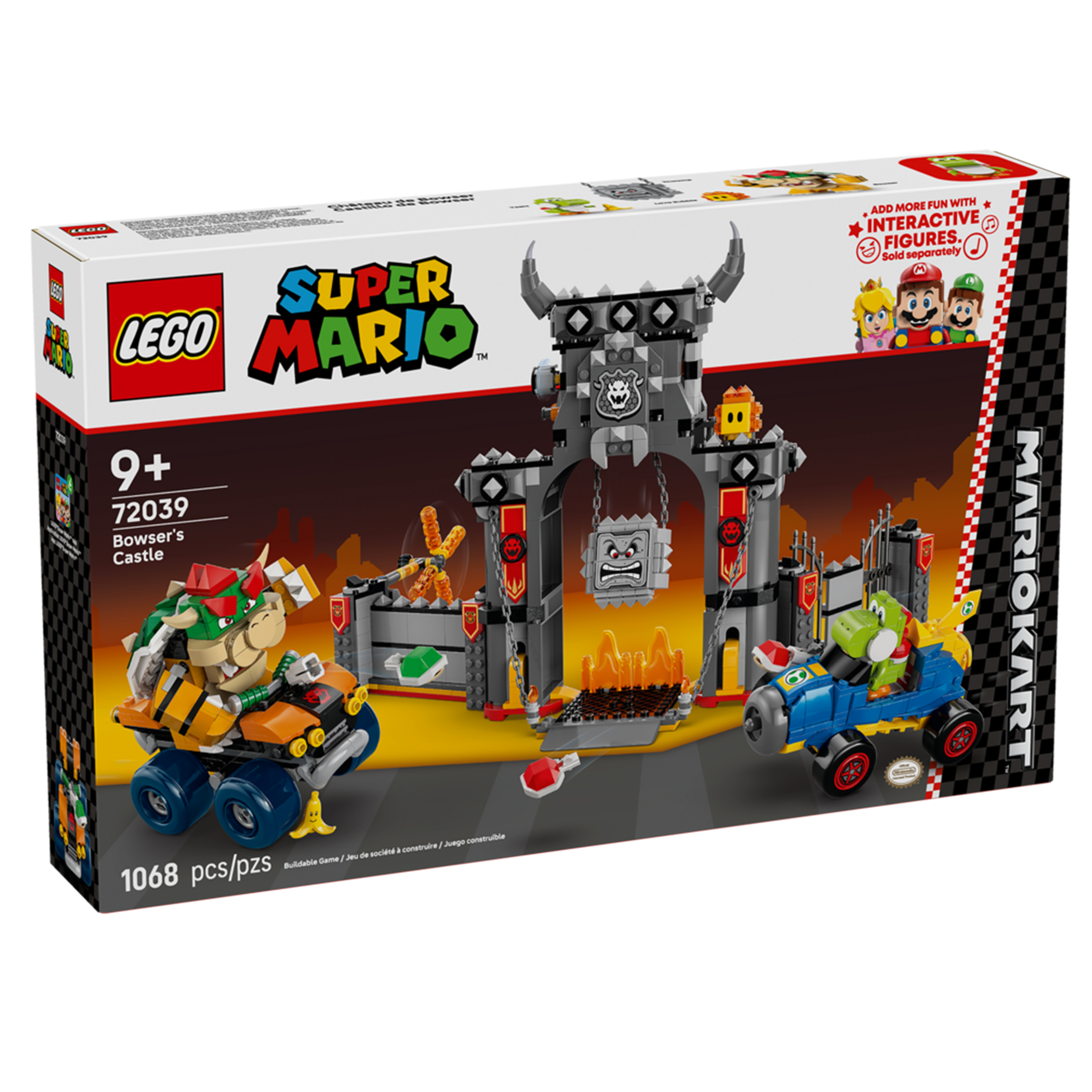 Zabawka konstrukcyjna zawiera cztery figurki LEGO Super Mario: Bowsera, Yoshiego, Thwompa i Lava Bubble. Dodaj figurkę LEGO® Mario™, LEGO® Luigiego™ lub LEGO® Peach™ (z zestawów 71439, 71440, 71441 lub 72043 — sprzedawane osobno), aby uzyskać interaktywną zabawę, w tym efekty dźwiękowe i wizualne z gry Mario Kart podczas jazdy.