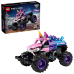 LEGO Technic 42220 – Monster Jam Sparkle Smash to energiczny zestaw dla dzieci od 7 lat. Zbuduj kolorowego monster trucka inspirowanego prawdziwą areną Monster Jam. Model ma motyw jednorożca, lśniące gwiazdki i charakterystyczny róg. Wygląda odważnie i przyciąga wzrok. Dzięki napędowi pull-back szybko rusza z miejsca. Samochód świetnie nadaje się do odtwarzania skoków i przejazdów. Solidna konstrukcja wytrzyma codzienną zabawę. To wybór dla fanów motoryzacji i magicznych motywów. Ucieszy młodszych i starszych budowniczych.